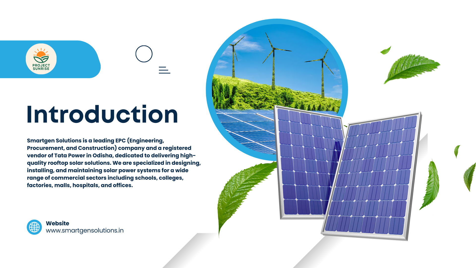 Smartgen Solutions is a leading EPC (Engineering, Procurement, and Construction) company and a registered vendor of Tata Power in Odisha, dedicated to delivering high-quality rooftop solar solutions. We are specialized in designing, installing, and maintaining solar power systems for a wide range of commercial sectors including schools, colleges, factories, malls, hospitals, and offices.